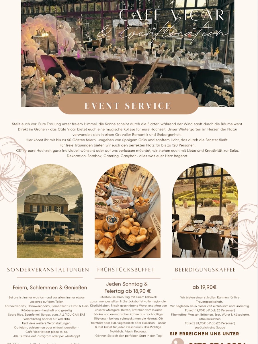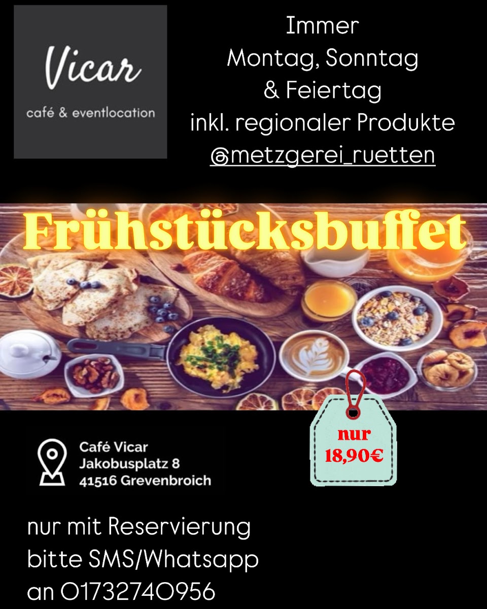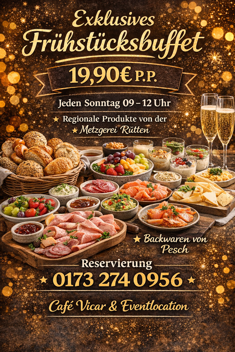 The menu at Café Vicar & Eventlocation offers a variety of options typical for a café setting, focusing on coffee and light meals. Visitors can expect freshly prepared breakfast dishes, suitable for morning visits, as well as coffee and other beverages ideal for coffee breaks throughout the day. Light snacks and buffet-style offerings are also available, providing a casual dining experience that accommodates both quick orders and relaxed gatherings.